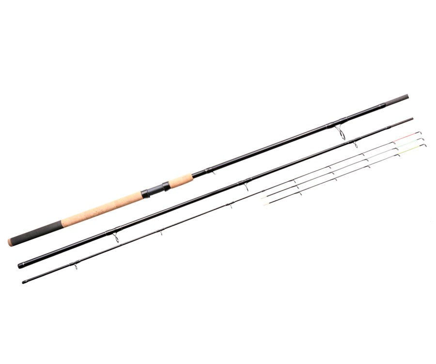 Feed rod in the most common and most popular length, suitable for use on most fishing techniques in a laid-down manner. Heavy action will allow you to throw heavy baskets at decent distances and cushion the lunges of big fish. Suitable for river fishing in places with a slight flow of water at a distance of 30-60 meters as well as for fishing for carp in still waters using the method of feeders. The optimal weight of the weights is 40-100 grams. The rod includes interchangeable carbon and laminate tips of different stiffness: 1oz, 2oz and 3oz.