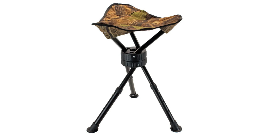 Podium camouflage shooting stool. The adjustable legs are made from durable, powder coated steel, while the seat is made from weather proof, camouflage fabric.