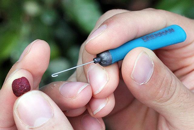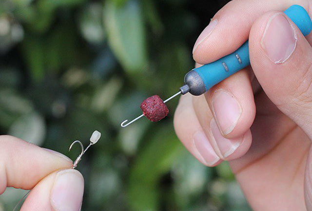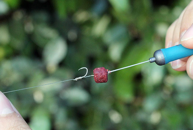 The handy tool enables you to securely mount baits such as expander pellets, meat, sweetcorn and drilled boilies onto a hair-rigged latex band without ripping or damaging the band.