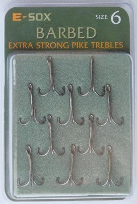 E-Sox Extra Strong Trebles are available in the three most effective and popular sizes 4s, 6s and 8s and in both Barbed and Semi Barbed versions.