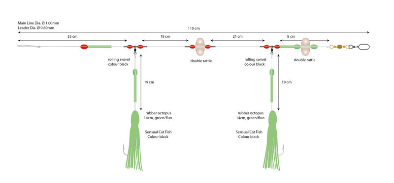 Great rig for wolffish and large cusk angling. Due to fluorescent octopus and rattlers, fish easily locate the bait - in this case, fish fillets are the best choice. Rig made for angling using heavy weights, in 50-100 m deep waters.