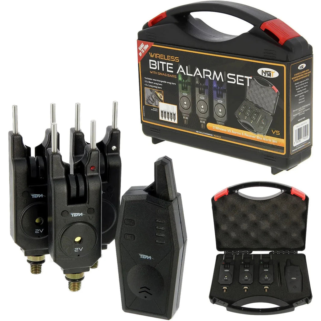 NGT VS 3pc wireless bite alarm set has an operating range up to 200m. Each NGT VS bite alarm offers a range of features including variable volume and tone control. Each VS alarm is supplied with two snag bar sets measuring 20mm and 75mm. This set is supplied in a modern, lightweight padded storage case.